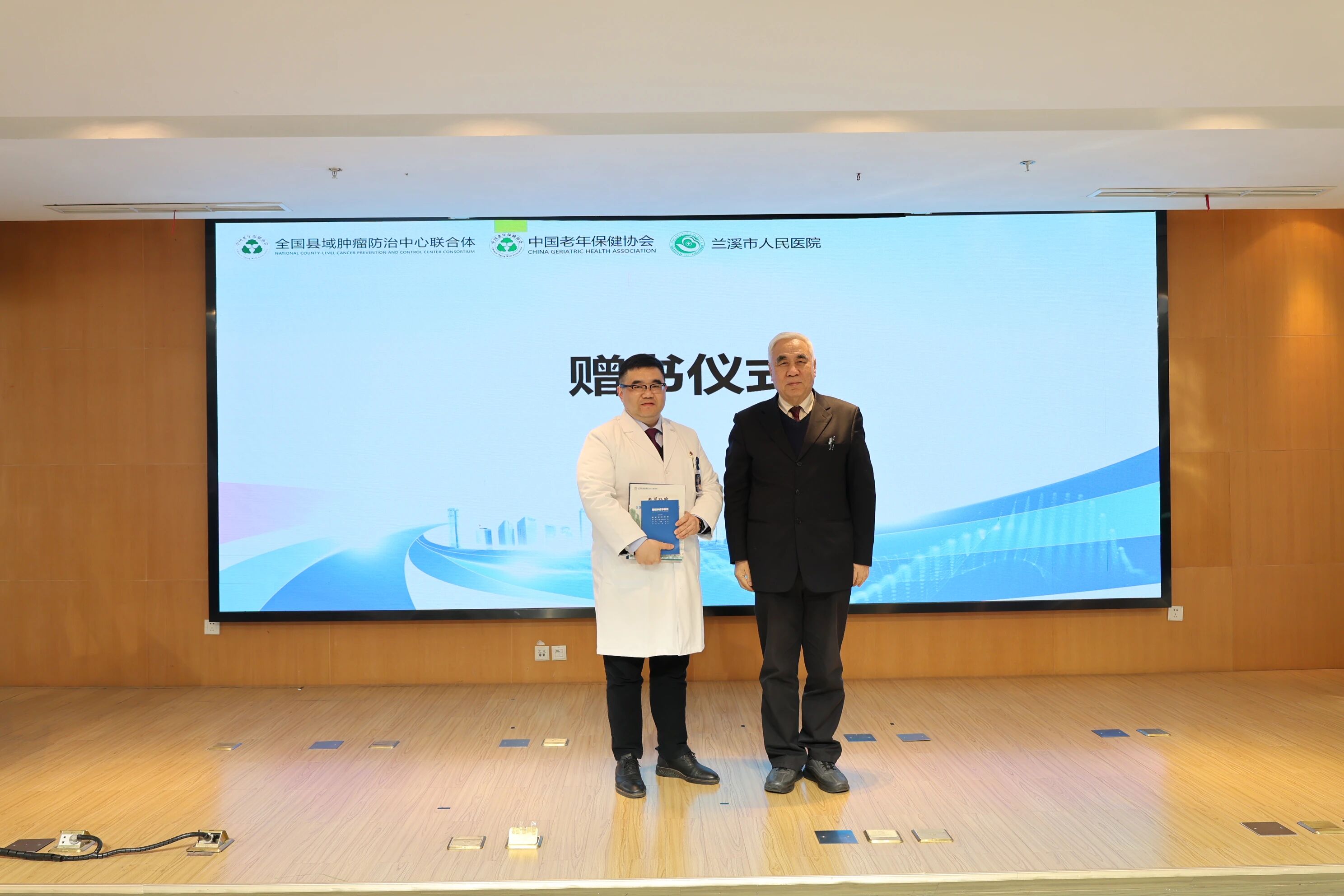 赵平教授将肿瘤防治中心创建相关指导书籍赠送了医院,医院党委书记孙里杨代表医院接受赠书。